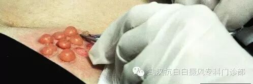 其具体方法是,先用75%的酒精,对供皮区(正常皮肤)进行消毒。然后根据受皮区(白斑区域)所需的面积,选择孔径在0.8~1.0c㎡的真空吸盘,在供皮区吸取不同数量的水泡(表真皮分离)。