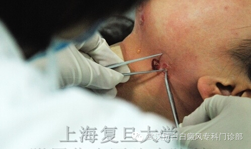 受皮区的处理方法现在比较常用的是两种。一种同样是采用吸疱的方法,适合小面积,散发、点状的病人。另一种是磨削法,将受皮区的表皮用机器磨去,根据医院不同,有些采取局部**有些不采取。